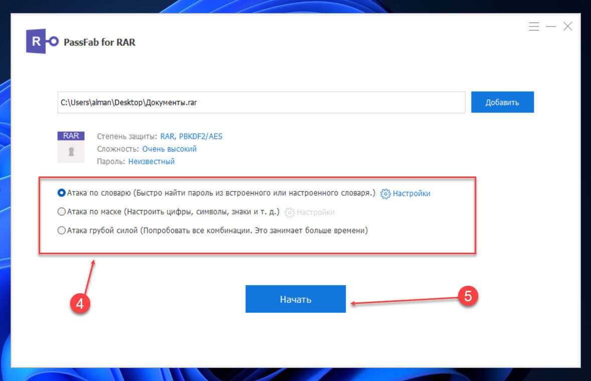 Шаг 5: После выбора нужного варианта атаки нажмите кнопку «Начать», будьте терпеливы пока программа не закончит подбор пароля для вашего архива.