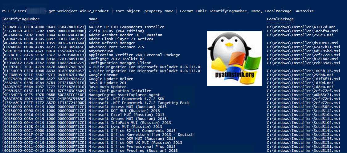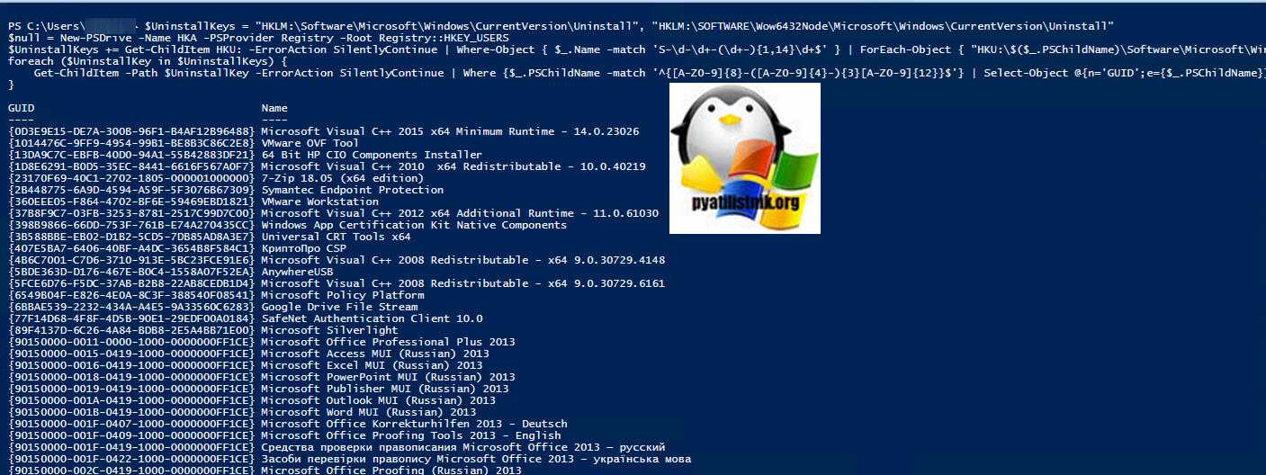 $UninstallKeys = «HKLM:\Software\Microsoft\Windows\CurrentVersion\Uninstall», «HKLM:\SOFTWARE\Wow6432Node\Microsoft\Windows\CurrentVersion\Uninstall» $null = New-PSDrive -Name HKA -PSProvider Registry -Root Registry::HKEY_USERS $UninstallKeys += Get-ChildItem HKU: -ErrorAction SilentlyContinue | Where-Object { $_.Name -match ‘S-\d-\d+-(\d+-){1,14}\d+$’ } | ForEach-Object { «HKU:\$($_.PSChildName)\Software\Microsoft\Windows\CurrentVersion\Uninstall» } foreach ($UninstallKey in $UninstallKeys) { Get-ChildItem -Path $UninstallKey -ErrorAction SilentlyContinue | Where {$_.PSChildName -match ‘^{{8}-({4}-){3}{12}}$’} | Select-Object @{n=’GUID’;e={$_.PSChildName}}, @{n=’Name’; e={$_.GetValue(‘DisplayName’)}} }