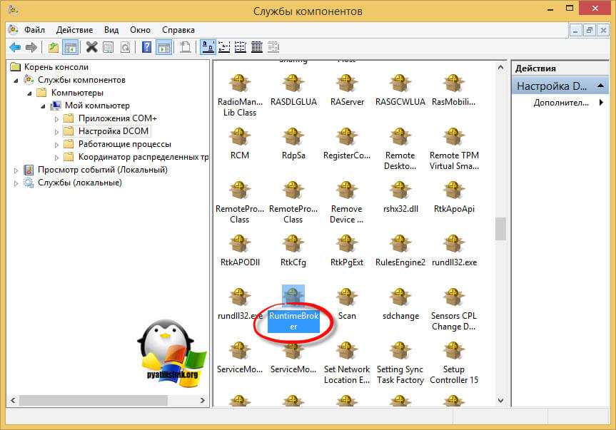 8. В диспетчере серверов в правом верхнем углу меню Средства -> Службы компонентов. Открываем Компьютеры –> Мой компьютер –> Настройка DCOM. Правый клик по строке из п.7 RuntimeBroker, Свойства.