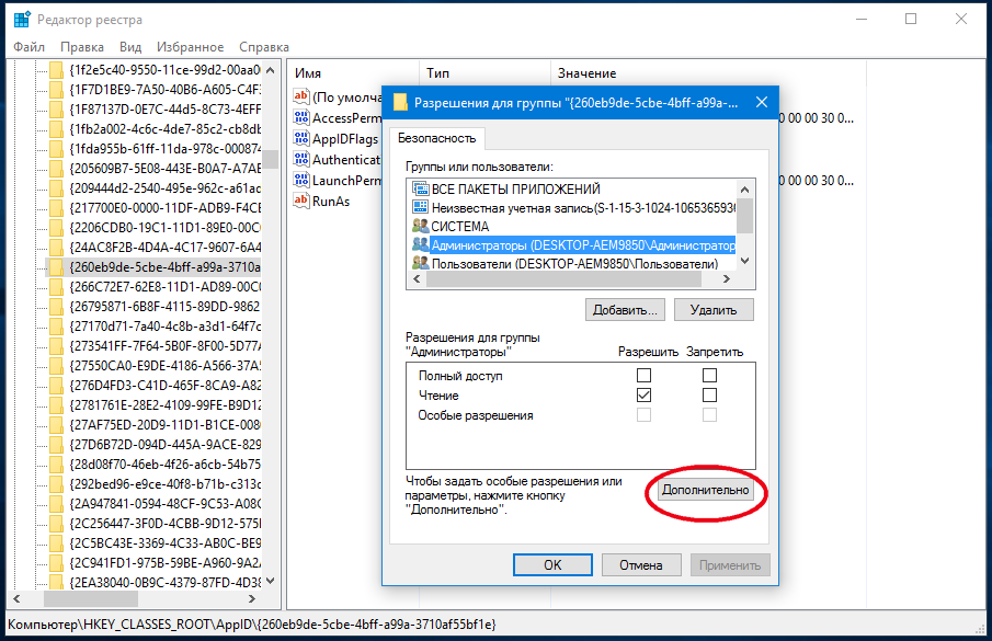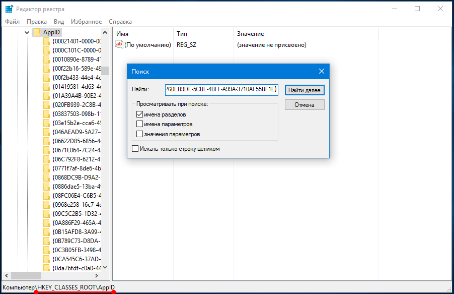 Задача заключается в том, чтобы определить, какому приложению принадлежит идентификатор, а затем предоставить пользователю или системе соответствующие права для его запуска. Проще всего это сделать через реестр. Откройте командой regedit редактор реестра и разверните ветку HKEY_CLASSES_ROOT/AppID. Воспользовавшись встроенным поиском, найдите в подразделе APPID приложения (в нашем примере это ).