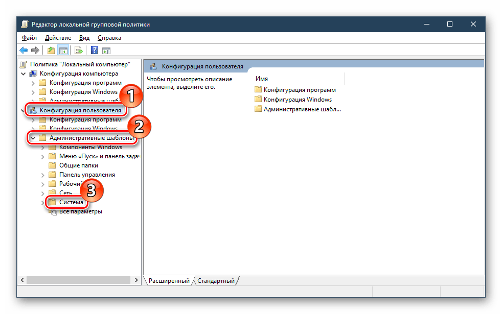 В открывшемся редакторе, в ветке «Конфигурация пользователя» найдите папку «Административные шаблоны», разверните ее и выберите папку «Система».