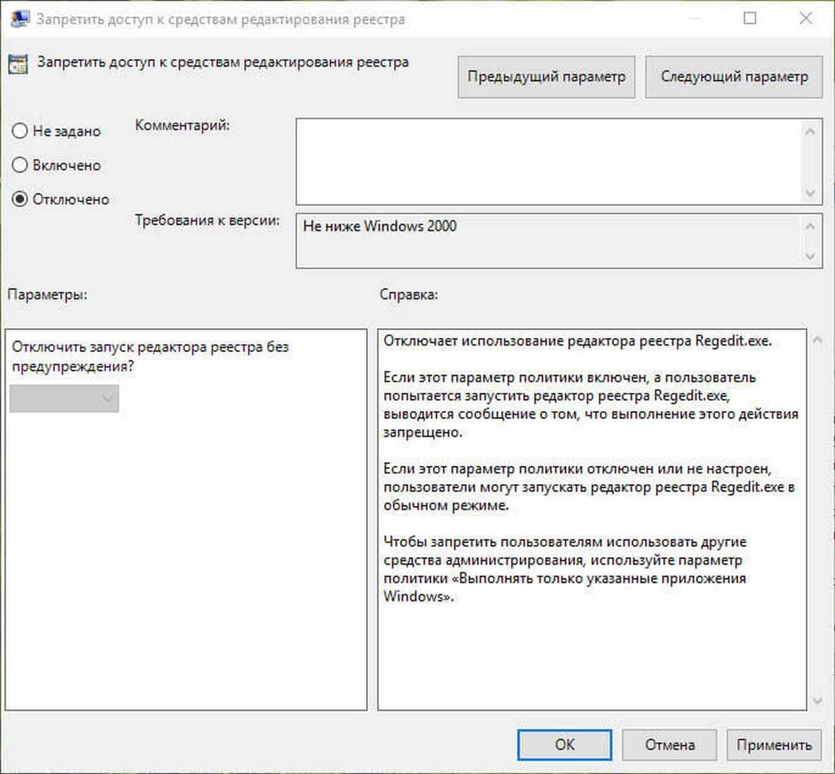 Если этот параметр политики отключен или не настроен, пользователи могут запускать редактор реестра Regedit.exe в обычном режиме.