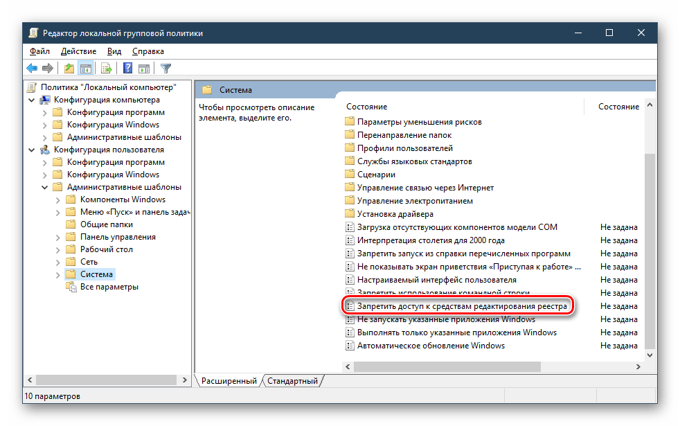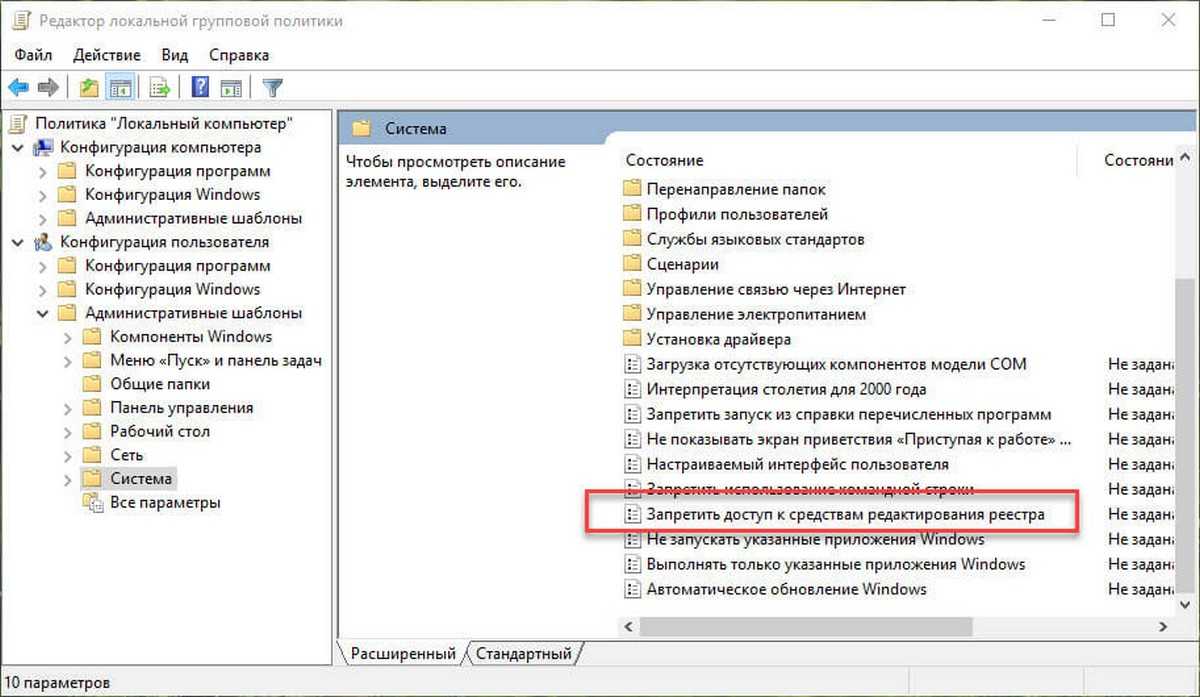 Данный способ применим только для корпоративный редакций Windows (в домашних версиях нет групповых политик). Открываем редактор групповой политики (команда gpedit.msc). Переходим в Конфигурация пользователя — Административные шаблоны — Система и находим раздел Запретить доступ к средствам редактирования реестрам: