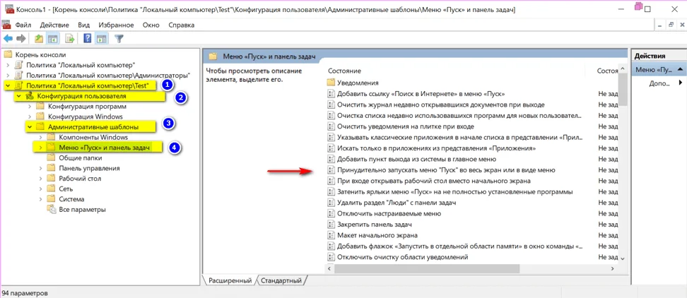 Ниже представлен лишь не полный перечень политик, который доступен в Меню Пуск и панель задач в операционной системе Windows 10 Pro: