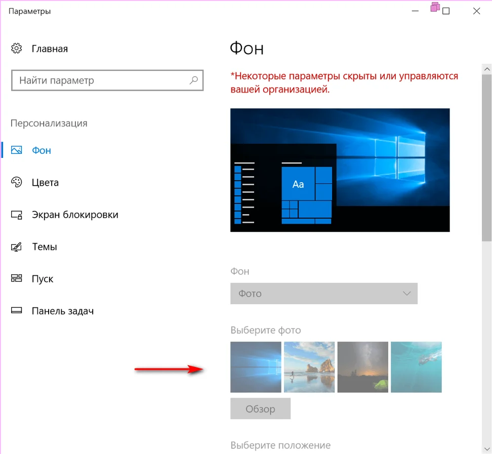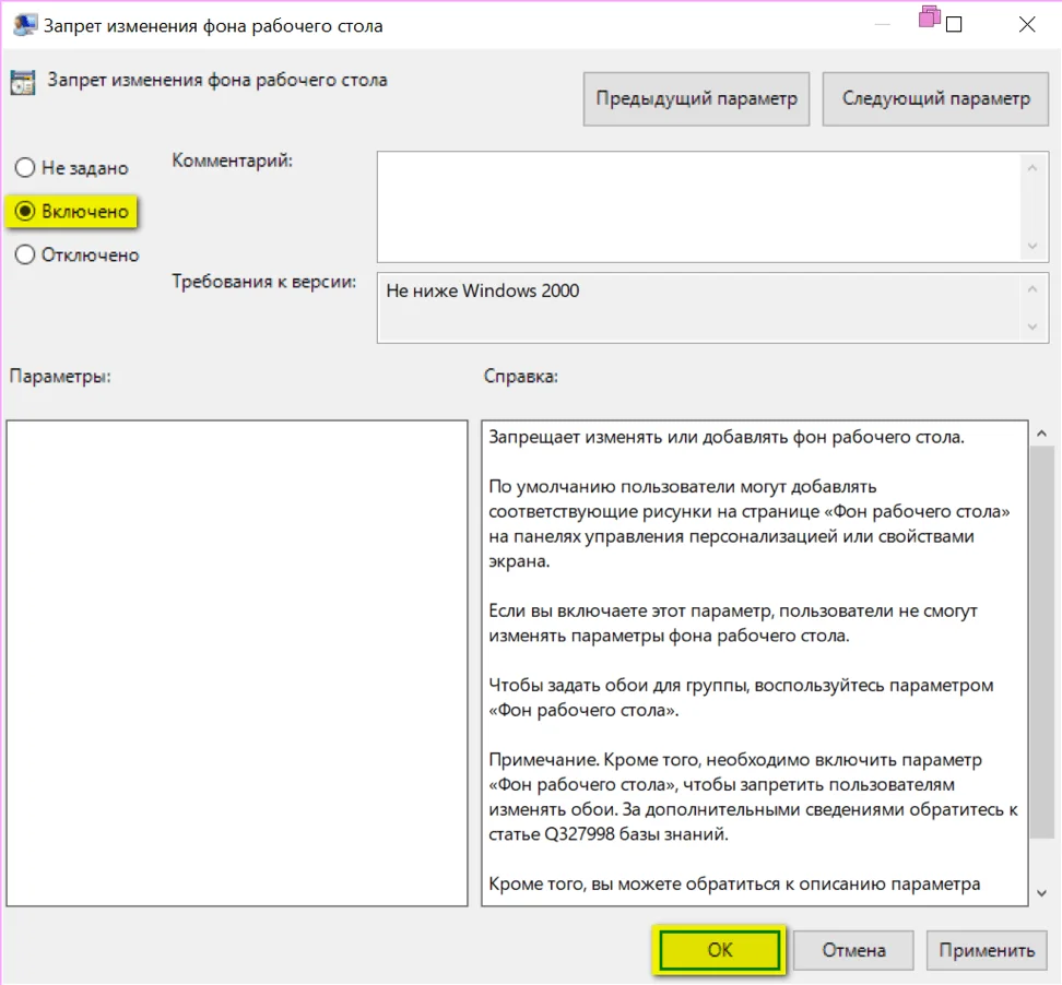 При активировании данной политики, при попытке изменить фон рабочего стола через настройки персонализации, данная опция будет не активна.