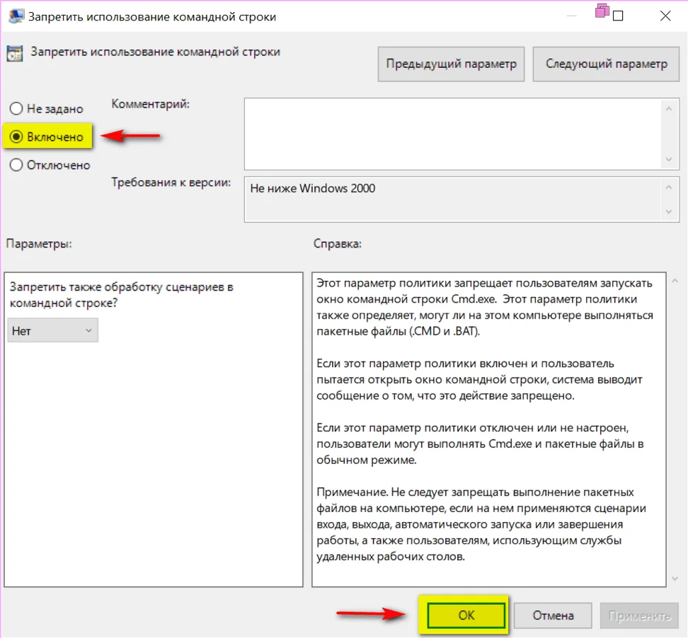 Рис.3 Редактирование параметра политики Запретить использование командной строки