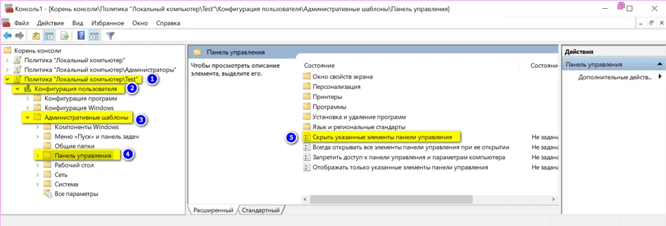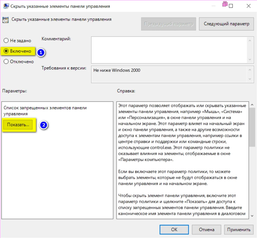 При администрировании рабочей станции иногда бывает целесообразно скрыть для неопытного пользователя определенные элементы панели управления. В статье Основы работы с редактором локальной групповой политики в ОС Windows 10 был рассмотрен механизм отображения только указанных элементов панели управления. В данном примере рассмотрен механизм скрытия определенных элементов из всего перечня апплетов панели управления. Для этого:
