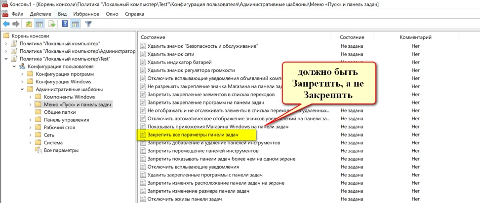 Рис.11 Редактирование параметра политики Запретить изменение размера панели задач