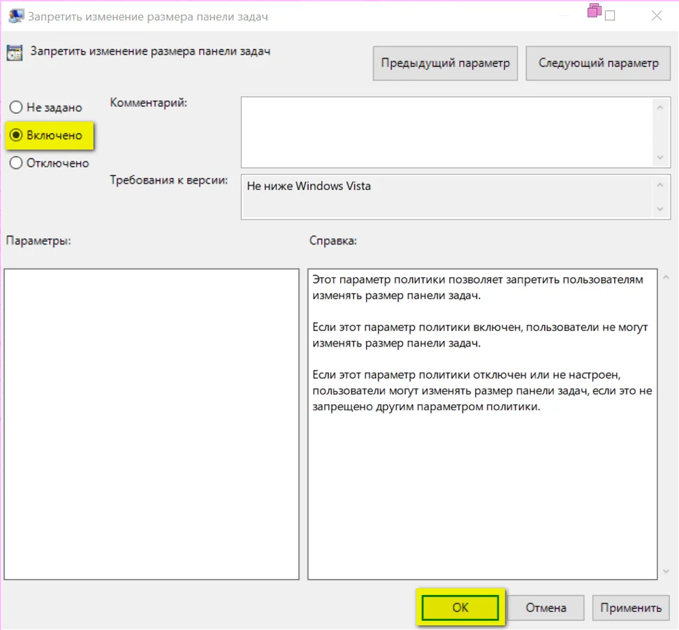 В данном примере будет рассмотрена политика Запретить изменение размера панели задач.