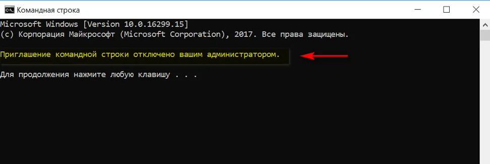 Если параметр политики Запретить использование командной строки включен и определенный пользователь откроет окно командной строки, будет выведено сообщение о том, что это действие запрещено.