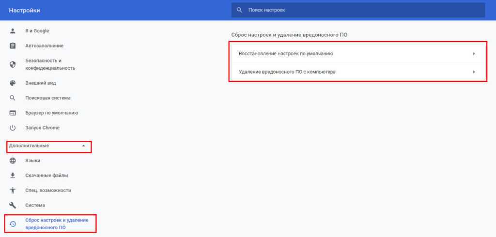 - В графе «Дополнительно» клацнуть по клавише «Сброс настроек и удаление вредоносного ПО»