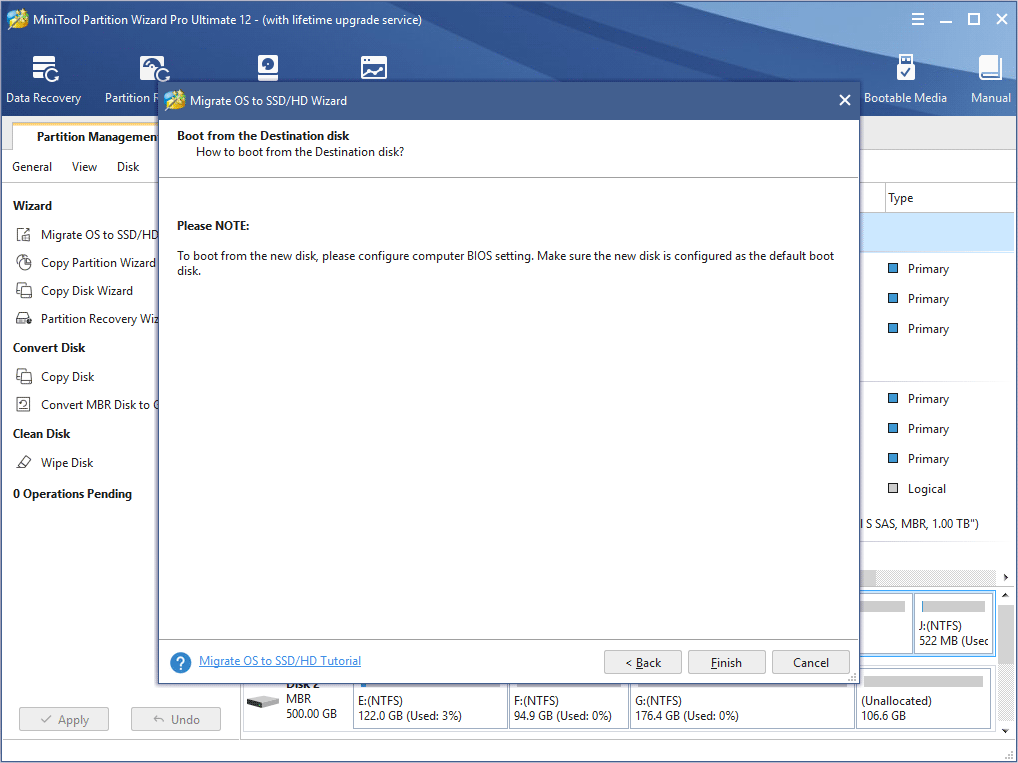 Step 8. This page will remind you to reset BIOS order, giving the new SSD boot priority, so your computer can boot from the new system disk successfully. Then click Finish.
