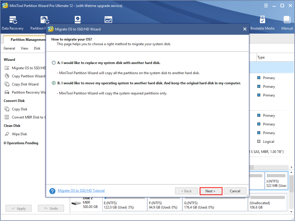 Step 4. Choose option B to move operating system to another hard disk, as the following picture shows.
