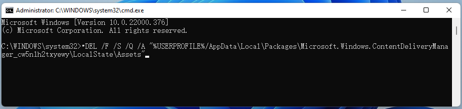 - DEL /F /S /Q /A «%USERPROFILE%/AppDataLocalPackagesMicrosoft.Windows.ContentDeliveryManager_cw5n1h2txyewyLocalStateAssets»