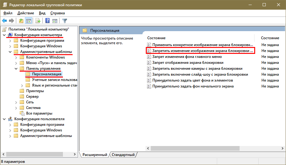 Во втором сценарии мы можем отключить политику, мешающую изменению фонового изображения: