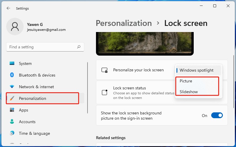 Step 2. Go to the Personalize your lock screen section and click on Picture or Slideshow from the drop-down menu. Then restart your computer.