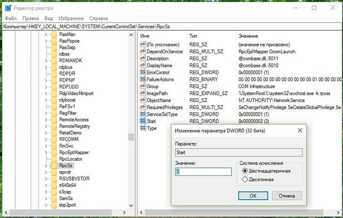 Еще раз повторюсь – вам нужно перейти в настройки этих служб в редакторе реестра и в конфигурации «Start» поставить значение: