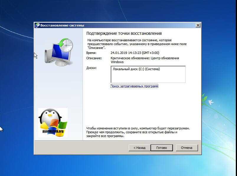 Вам покажут, какой диск будет восстановлен, в большинстве случаев, это диск C:\, нажимаем готово.