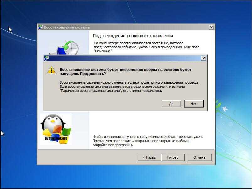 Вас уведомят, что данный процесс если запущен, то его уже не отменить, это нужно понимать. Учтите, что ваши персональные данные не удалятся, единственное могут пропасть некоторые обновления или программы, которые вы устанавливали, после создания данной точки отката. Соглашаемся.