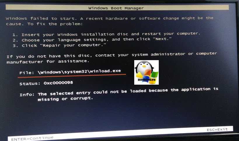 Info: Не удалось загрузить операционную систему, так как критически важный системный файл отсутствует или содержит ошибки.