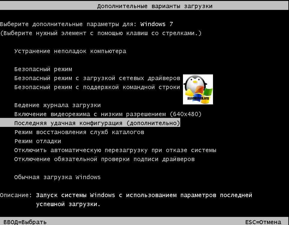 Первый пункт «Последняя удачная конфигурация», попытается загрузить последнюю рабочую версию системы (Попасть в данное меню можно нажатием клавиши F8 при загрузке вашего компьютера). Если у вас получилось загрузить последнюю рабочую конфигурацию, то в системе так же выполните chkdsk и sfc /scannow, как я описывал выше.