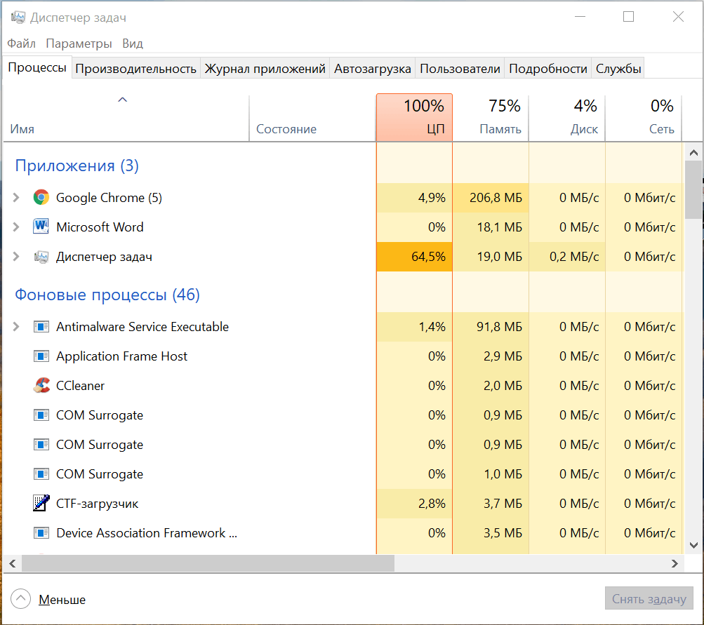 После обнаружения виновного приложения нужно остановить его работу через всё тот же «Диспетчер задач». Открываем его сочетанием Ctrl+Shift+Esc, переходим на вкладку «Процессы», находим компонент, связанный с приложением, и завершаем его выполнение.