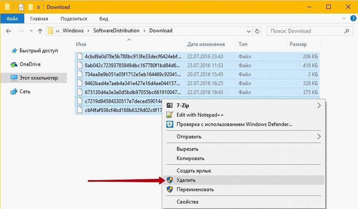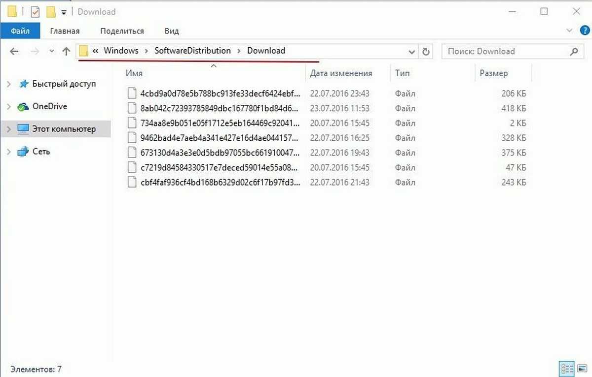 Скачанные, но ещё по каким-либо причинам не установленные или установленные недавно обновления также хранятся в памяти компьютера. Некоторые скачанные обновления зависают, из-за этого не могут установиться. Все такие обновления находятся в папке Основного_диска:\Windows\SoftwareDistribution\Download. Перейдя в эту папку, вы найдёте подпапки с длинными именами, можете удалить их все или только определённые, ориентируясь на код в названии и дату создания. Удаление осуществляется обычным перемещением в корзину, то есть кликните по ним правой клавишей мыши и примените функцию «Удалить».