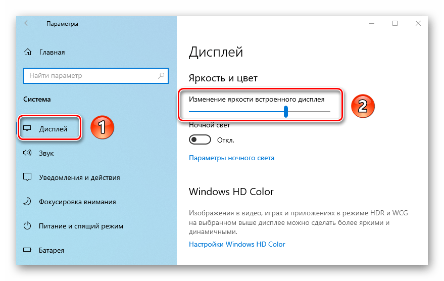 Ползунок яркости отображается в центре уведомлений Windows 10 версии 1903. Чтобы найти ползунок яркости в более ранних версиях Windows 10, выберите Параметры > Система > Экран, а затем переместите ползунок изменения яркости для регулировки яркости.