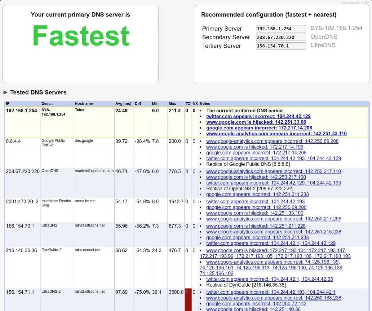 Если вы посмотрите на верхнюю часть, вы обнаружите, что текущий основной DNS является самым быстрым, а это означает, что нет причин что-то менять. Вы также можете увидеть рекомендуемую конфигурацию справа, включая первичный, вторичный и третичный серверы.