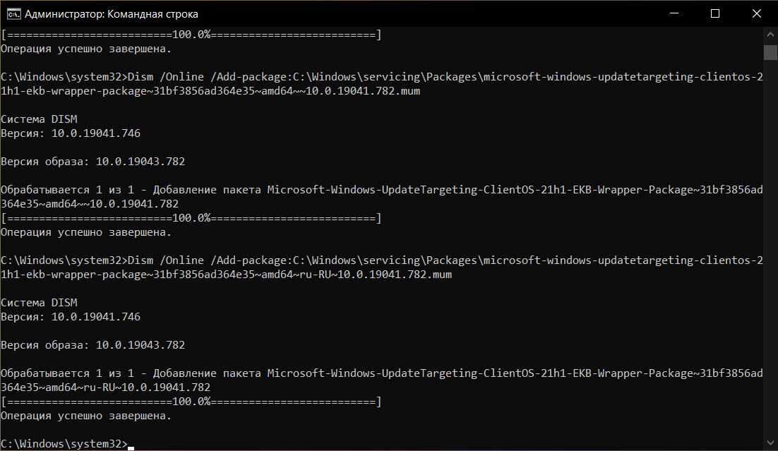 Теперь необходимо выполнить несколько команд которые разблокируют Windows 10 версии 21H1 (сборка 19043).