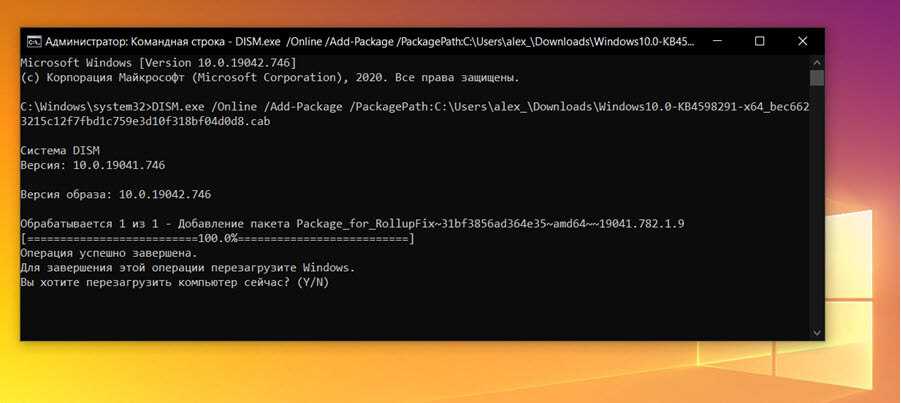 DISM.exe /Online /Add-Package /PackagePath:»C:\Users\Name\Downloads\Windows10.0-KB4598291-x64.cab»