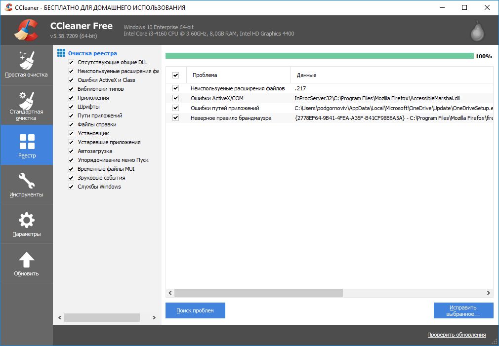 Реестр. CCleaner сканирует реестр Windows на наличие ошибок и «пустых» записей.