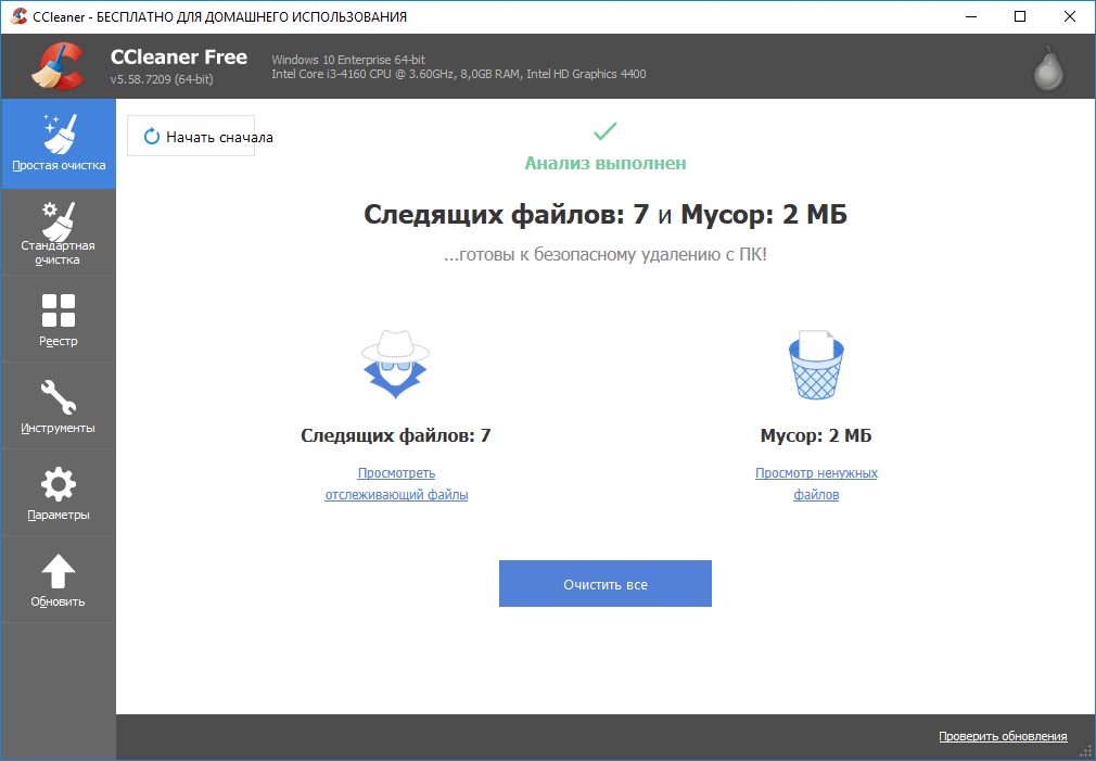 Простая очистка. Выполняет поиск по наиболее часто используемым папкам. На мониторе отобразится итоговый результат.
