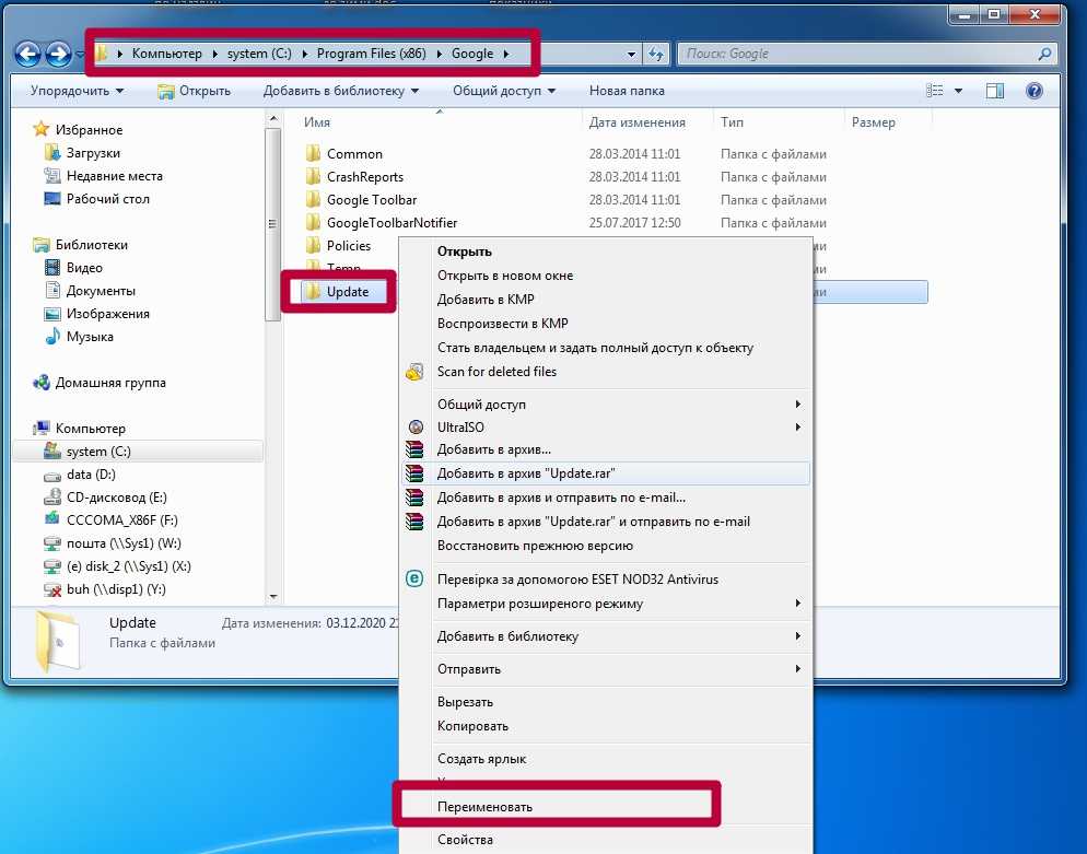 Заходим в папку Google на системном диске, в которую установлен браузер. Находим внутри папку Update – и изменяем ее имя. Имя можно написать любое, но все равно оставьте слово Update, чтобы впоследствии понимать, для чего нужна эта папка, и быстро ее найти.