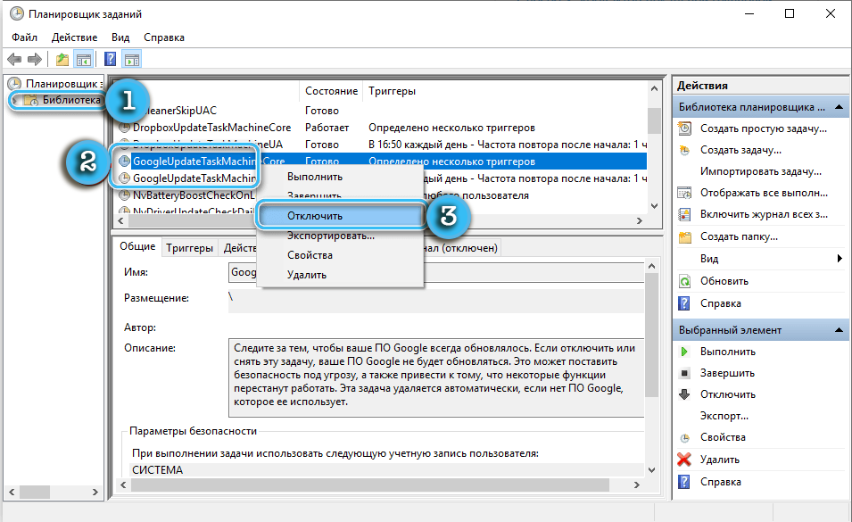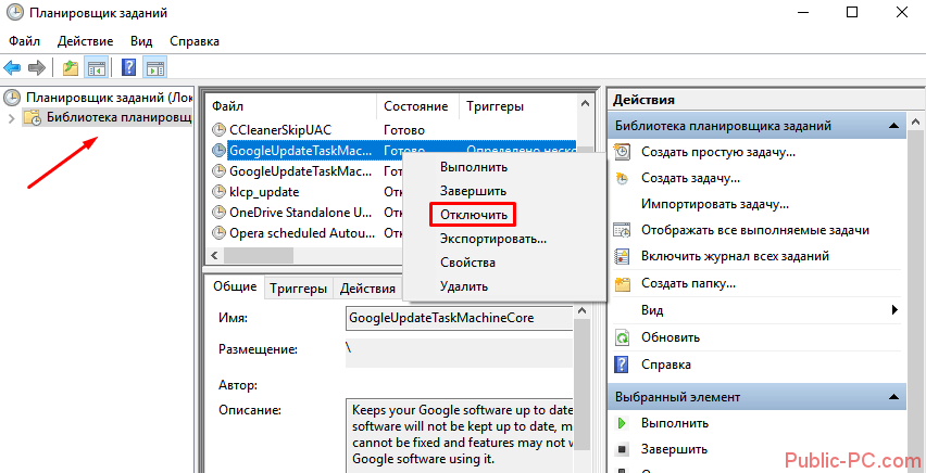 Также желательно отключить выполняемую задачу в Планировщике заданий. Найдите его в поиске по ключевым словам, кликните на «Библиотека планировщика» и отключите задание GoogleUpdateTask через правую кнопку мышки.