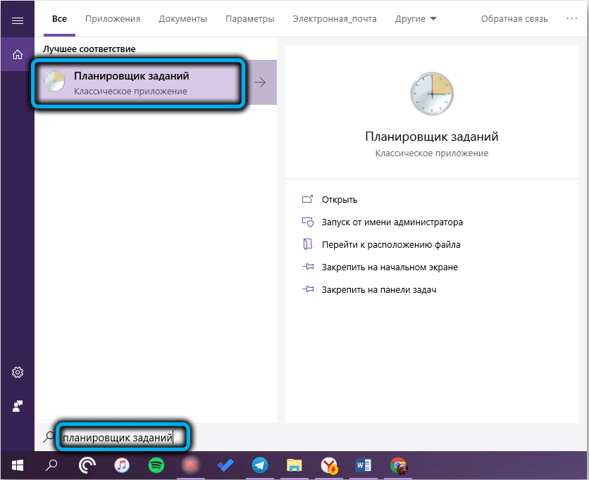 - В поисковой строке Windows надо вписать фразу «планировщик заданий» и открыть нужный инструмент.