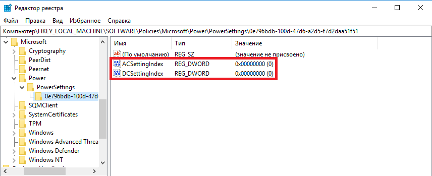 Ну и последний, самый крайний способ. Его можно применять для домашних редакциях Windows 10, на которых нет редактора локальных групповых политик. Для отключения запроса пароля надо в ветке реестра HKEY_LOCAL_MACHINE\SOFTWARE\Policies\Microsoft\PowerSettings\0e796bdb-100d-47d6-a2d5-f7d2daa51f51 для параметров ACSettingIndex (питание от сети) и DCSettingIndex (питание от батарей) задать значение 0.