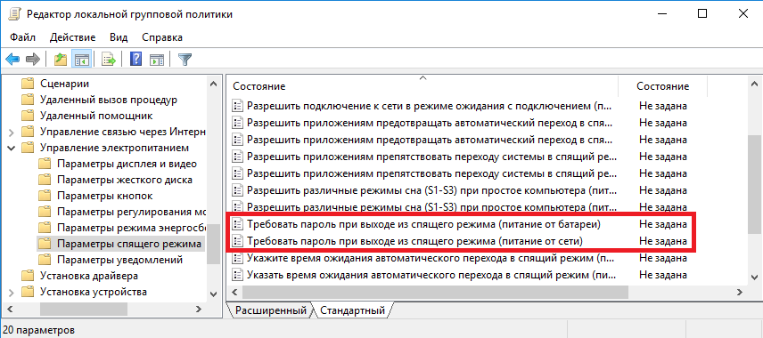 Нужные настройки находятся в разделе Конфигурация компьютера\Административные шаблоны\Система\Управление электропитанием\Параметры спящего режим. Здесь так же есть два параметра, один для питания от сети, второй — от батарей.