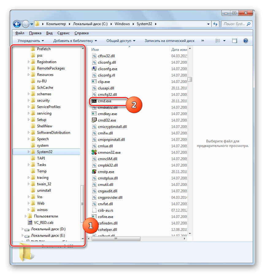 Запустить командную строку можно с помощью проводника. Дело в том, что cmd.exe – это файл, который запускается стандартным образом. Она находится на диске C (1) в папке Windows-System32. Запустить его можно стандартным двойным щелчком мыши (2).