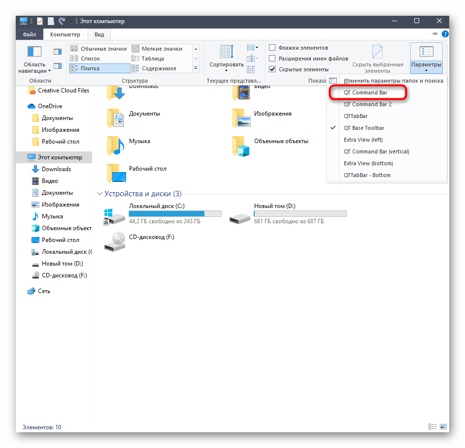После установки программы панель вкладок или другие панели автоматически не появятся – их нужно включить вручную. Для этого, если вы используете Windows 7, нажмите клавишу ALT в Проводнике, чтобы показать строку меню, а затем включите нужную панель инструментов QT в меню «Вид». В Windows 8/8.1 или Windows 10 перейдите на вкладку «Вид» в ленте Проводника, нажмите на стрелку раскрывающегося меню под кнопкой «Параметры» и включите желаемую панель.
