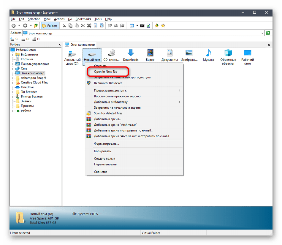 После запуска ПО обратите внимание на реализацию обозревателя. Все каталоги выполнены в древовидном виде, а на панели справа отображается текущее расположение и все активные вкладки.. Щелкните ПКМ по любому из каталогов, чтобы открыть его в новой вкладке, выбрав для этого пункт «Open in New Tab» в соответствующем контекстном меню.