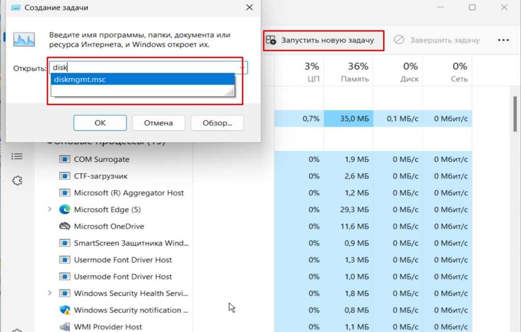 Запуск управления дисками в окне «Выполнить»