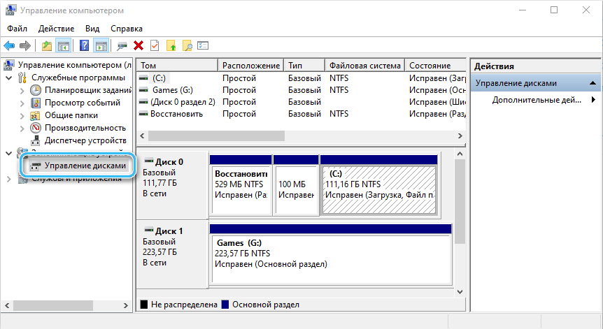 Управление дисками в окне «Управление компьютером»