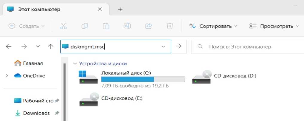 Открыть управление дисками в Windows 11 можно еще из какой-нибудь папки. Откройте проводник: мой компьютер, из панели быстрого доступа или клавишами Windows+E. В адресной строке, где обычно находится местоположение текущей папки, напишите «diskmgmt.msc» (сокращение от disk management) и нажмите Enter, в строке на секунду появится путь до этого файла. Появится оснастка управления томами.