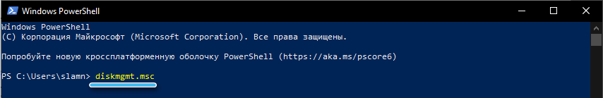 Необходимо запустить приложение PowerShell, отыскав его при помощи встроенного поиска. Далее вводится команда diskmgmt.msc, а действия подтверждаются клавишей ENTER.