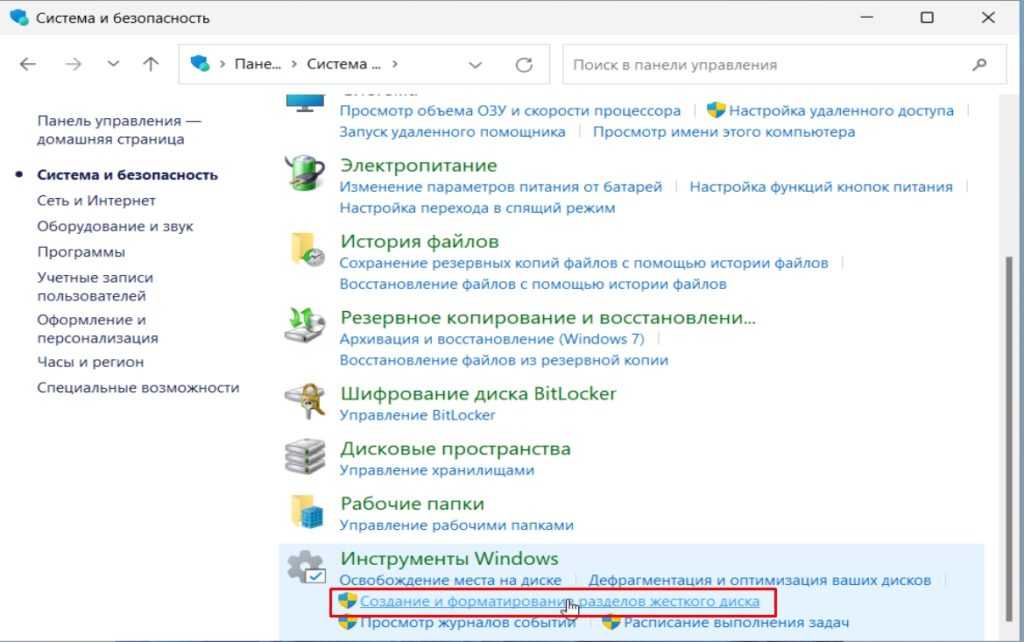 Панель управления открывается в поиске или в «Пуск». В ней переходите в «Система и безопасность». Там в самом низу есть графа «Инструменты Windows», нажимайте на «Создание и форматирование разделов жесткого диска».