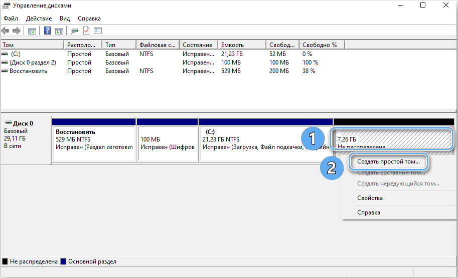 Чтобы создать новый раздел, достаточно прямо в программе выбрать неразмеченную область на диске и щёлкнуть по ней правой кнопкой мыши. В контекстном меню выбирается пункт «Создать простой том…». Далее указывается размер нового раздела и его буквенное обозначение. Используемый символ не должен совпадать с названиями других существующих на компьютере дисков.