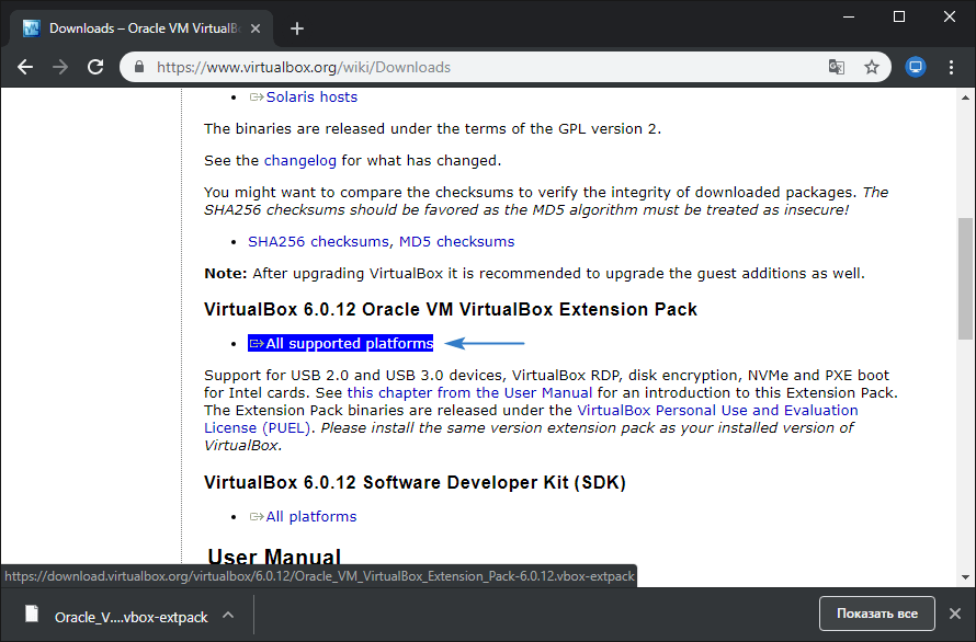 Теперь скачайте «VirtualBox Extension Pack» добавляющий поддержку устройств USB 2.0 и USB 3.0, VirtualBox RDP, шифрование диска, загрузку NVMe и PXE для карт Intel.