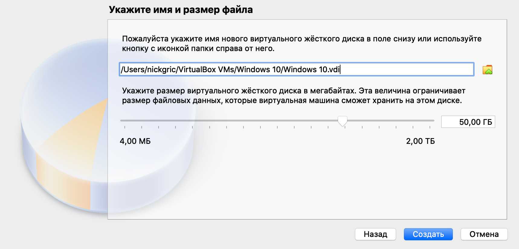 Размера 50 гигабайт будет достаточно, но можно увеличить или уменьшить его, например для Windows 10 версии 1903 необходимо минимум 32 ГБ свободного места. Определитесь и создайте диск.