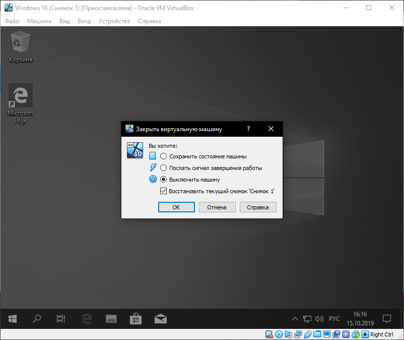 Закройте VirtualBox, отметьте «Выключить машину«, установите галочку «Восстановить текущий снимок«.